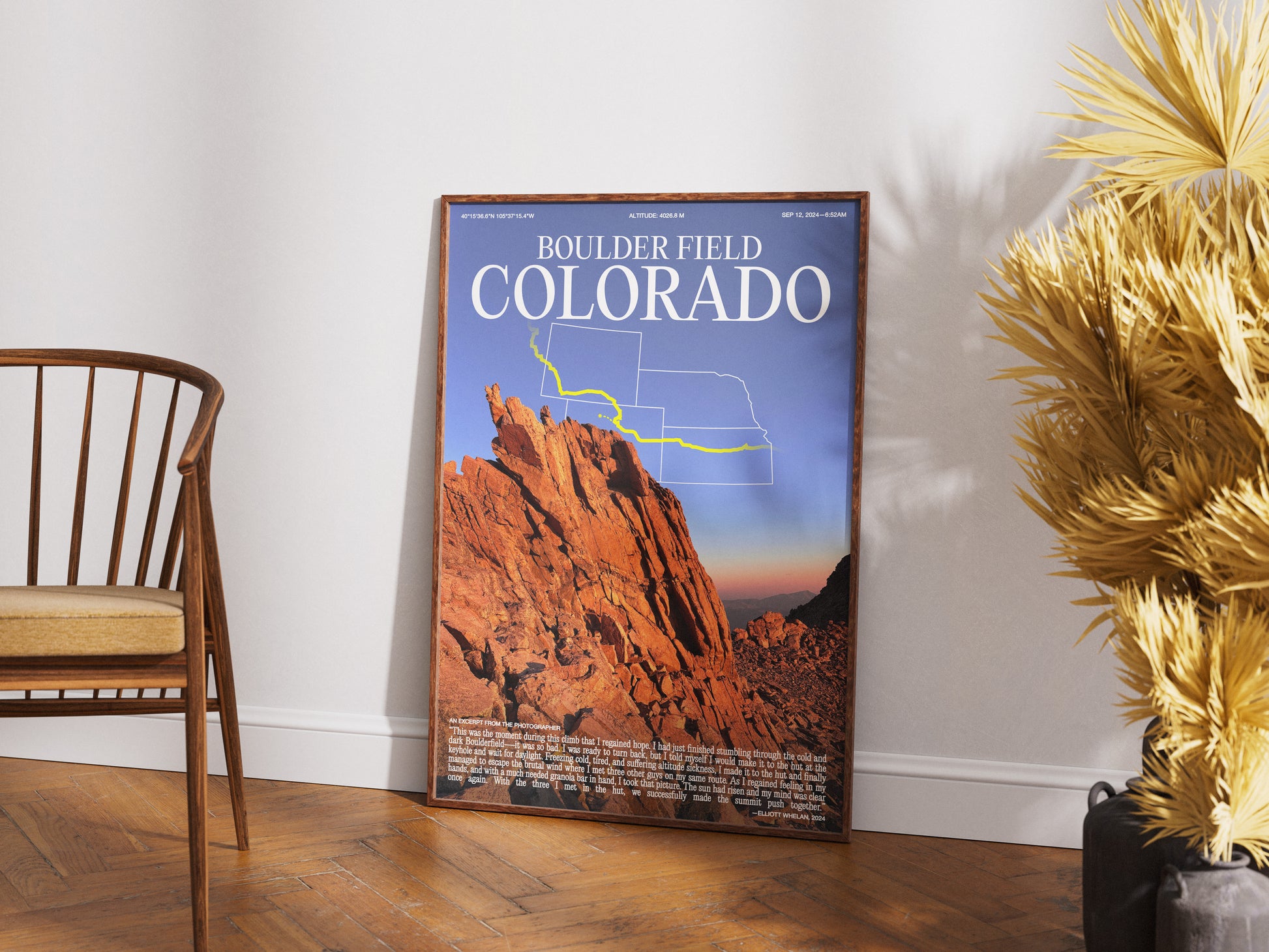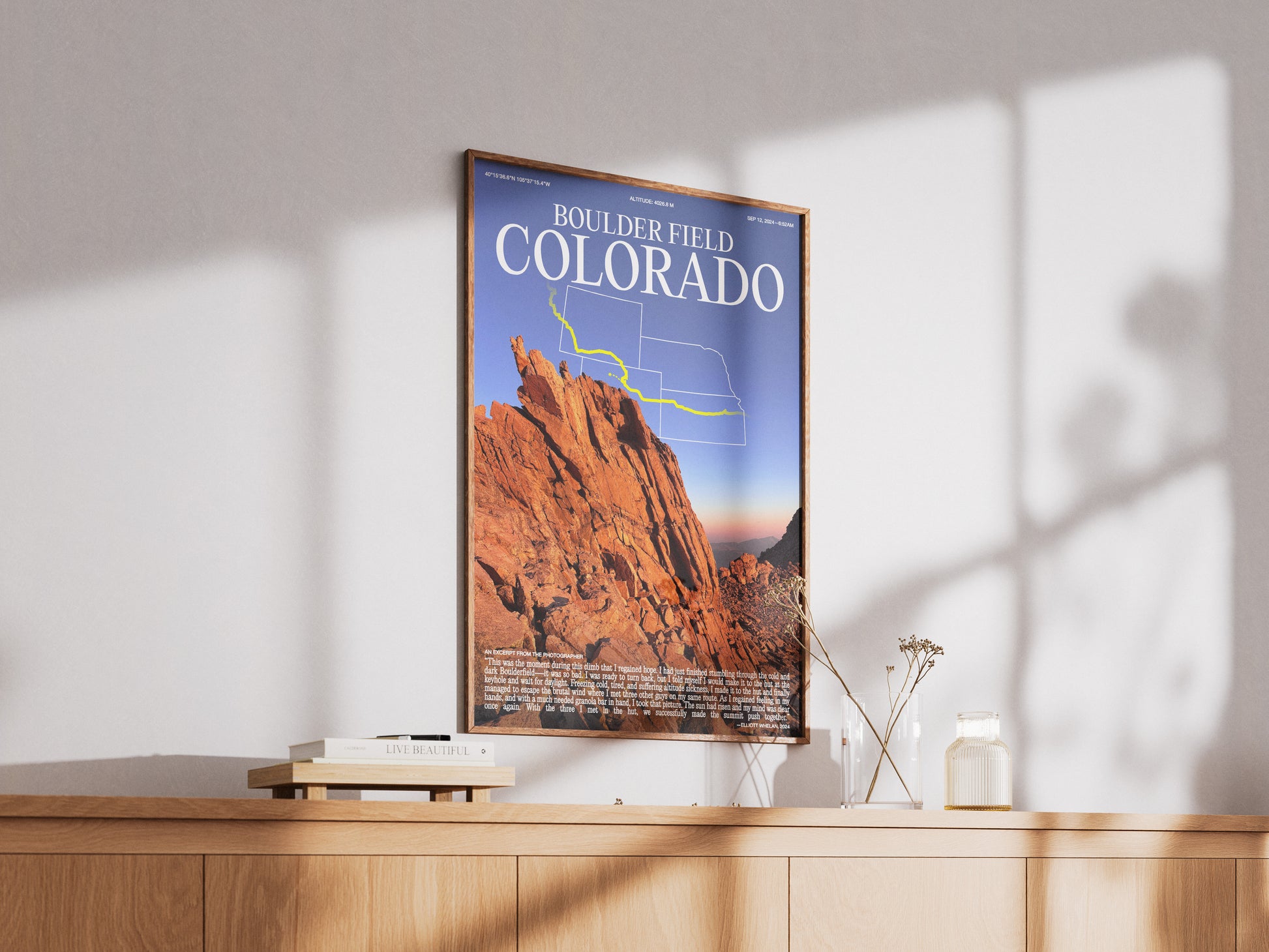 Admire Colorado's beautiful Boulder Field with this poster print. With stunning colors, striking scenery, and the photographer's story, this print is a gem for anyone looking to add a touch of nature photography to their home! With small details throughout the poster, this print is a wonderful conversation piece for any room.